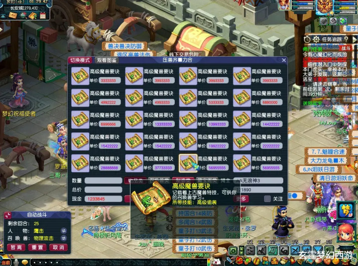 第二个原因是有点道理的。现在好一点的区,攻宠技能高兽决的价格已经涨到不可思议,例如高偷袭一本500元,差一点的区,一本也有五六千万梦幻币,这也是导致大家觉得云游道人会来的主要原因。但是大家想想,攻宠兽决的涨价其实是原因的,天狗的小观照万象、高级蓄势待发甚至是高级金蝉脱壳的放出,让打书、炼妖市场非常火爆,高兽决供不应求涨价是必然的。